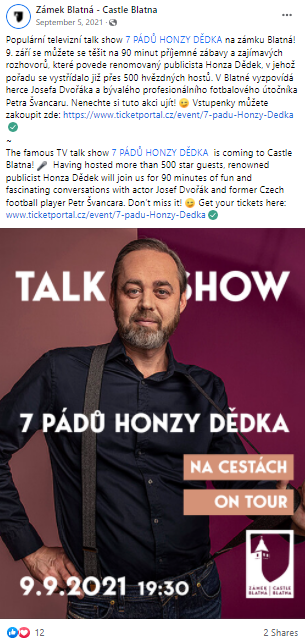 Zámek Blatná je místo, kde se můžete projít v nádherném rozsáhlém parku s řekou Lomnice, nakrmit daňky a kochat se i výhledem na pávy. Po prohlídce interiérů s průvodcem přijde vhod také zastávka v Oh My Deer café, kde vám připraví dobrou kávu, vynikající dorty nebo domácí limonádu. Prostředí zámku Blatná je v sezóně velmi živé místo se spoustou kulturních akcí. Pro zámek jsem tvořila obsah na Facebooku včetně zadávání vizuálů grafikovi a copywritingu. Připravovali jsme také kampaně s cílem prodávat lístky na akce pořádané zámkem.